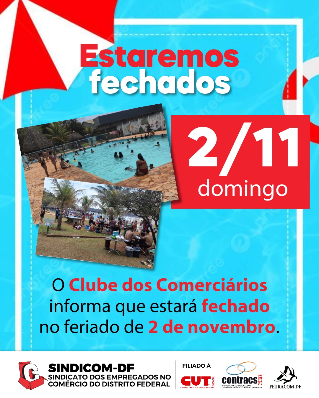 O Sindicato dos Comerciários do Distrito Federal (Sindicom-DF) informa que o Clube dos Comerciários estará fechado neste domingo, 2 de novembro, em respeito ao feriado de Finados.